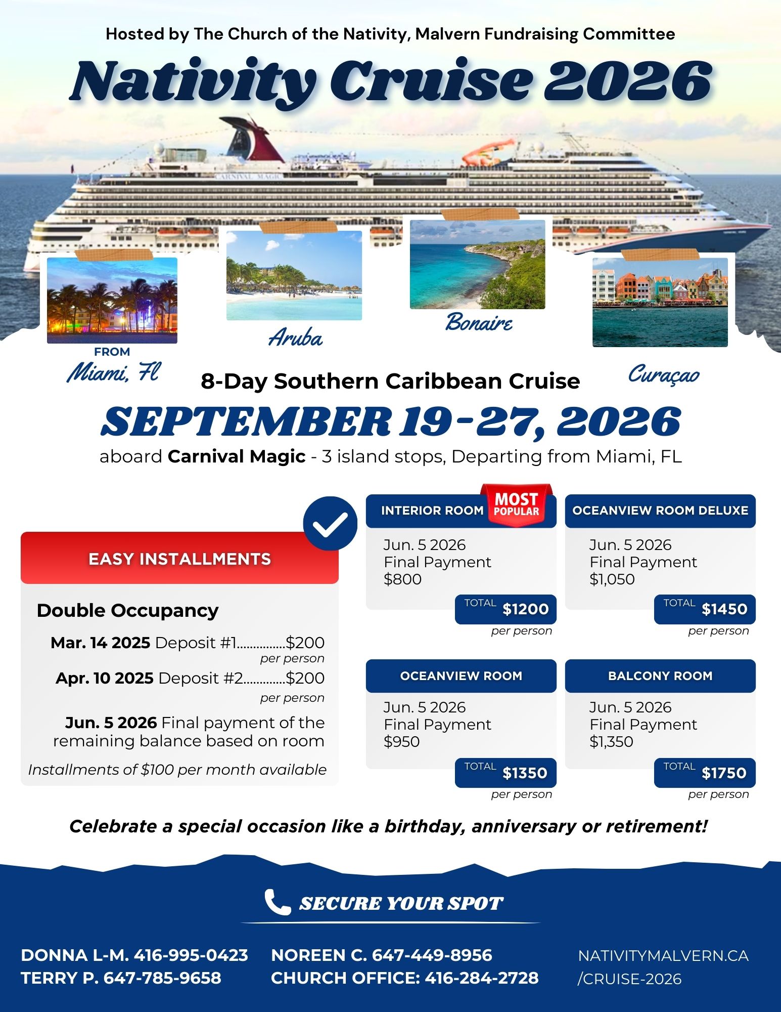 Get into contact with the church office to secure your trip spot with a fundraising committee member today! nativitymalvern@toronto.anglican.ca or 416-284-2728
